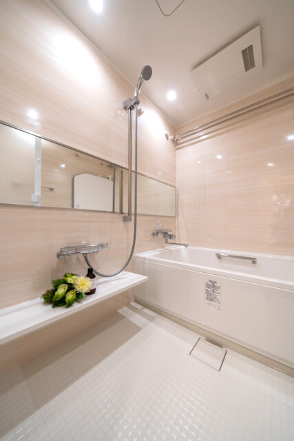 浴室です。木目調パネルをふんだんに使った明るいカラーの浴室は、まるでお部屋のように寛げる空間です。一日の最後に疲れを癒すには最適な空間となっています。