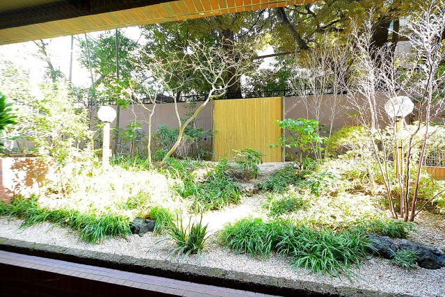 ピカピカに磨かれたガラスの向こうは緑あふれる中庭。
