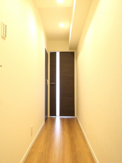 廊下側に洗面室と洗濯機置場、正面の扉の奥がLDK、洋室になっています。