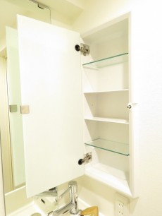 鏡の横の壁面には洗面まわりの小物を仕舞っておくのに便利なキャビネットが設置されています。