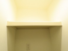 トイレはウォシュレット付き。壁面に収納が設置されています。