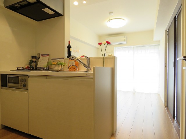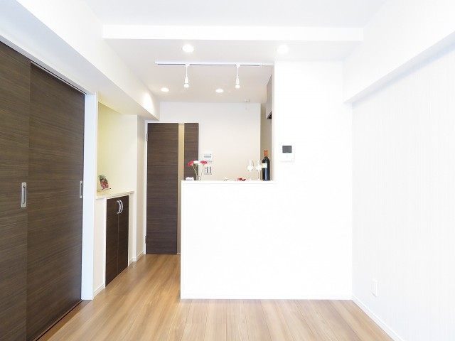 LDK内にはカウンターも設置されており、お好みのインテリアなども手軽に飾っておけます。カウンター下のスペースは日用品のストックなどの保管場所にしてもよさそうです。