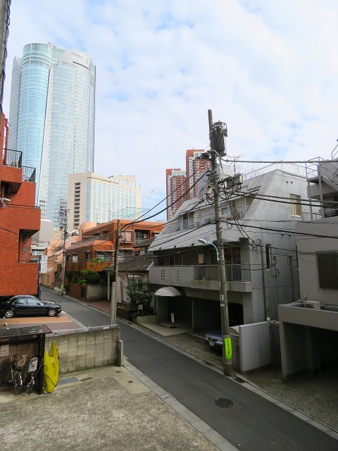 エントランス前の道路は少し坂になっています。六本木ヒルズがドーンと建っているのが見えます。