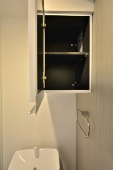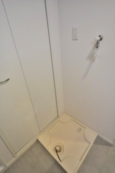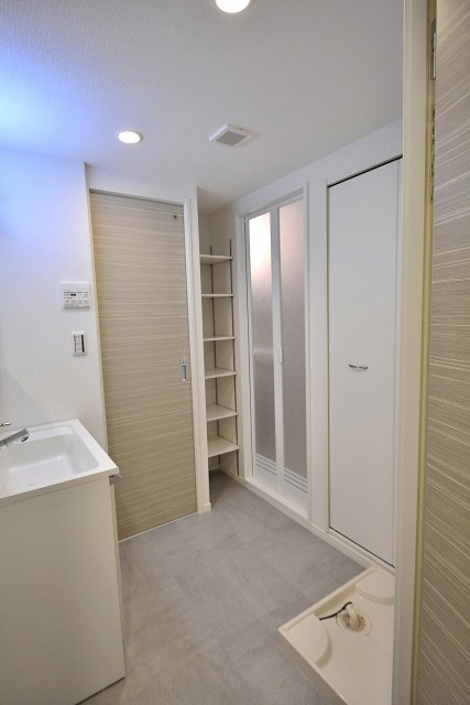 サニタリールームに入ってすぐ右側に洗濯機置場があります。収納用の棚がありませんので、上部の壁にちょっとした棚を取り付けてみてはいかがでしょうか。