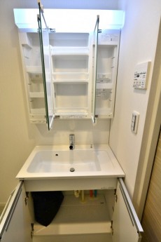 洗面台は新規に取り替えているので、とても綺麗です。シンクの右側にカウンターがあるので、お出かけ準備の際はここに色々置けて便利です(*^^)v