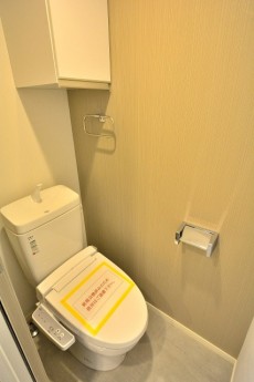 洗面台の隣にトイレがあります。上部に吊り棚があるので、トイレ内は床に物を置かずに済むのでいつも清潔にできそうです☆