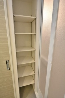 トイレの扉の隣には可動式の棚があります。バスタオルのストックや着替え置場、お掃除道具置場など、色々と活躍してくれそうです(^o^)