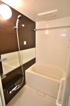 バスルームはシックなダークブラウンのパネルが落ち着いた雰囲気の110cm×160cmサイズ。