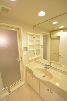 サニタリールームはリビングから入ります。大きな鏡がうれしいですね。