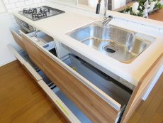 物の出し入れがしやすいスライド収納にコンロは3口、グリル付きと設備も◎!
