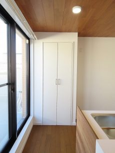 写真だと分かりずらいですが中は奥行きがあり、食器棚も置けそうです。生活感のでがちなアイテムも見えないところに仕舞っておけるのがいいですね。