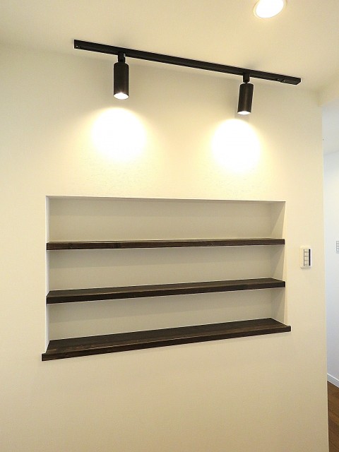 玄関をあがってちょうど正面の壁面にはこんな棚がつくられています。