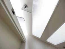 白基調の明るい玄関ホール。人感センサーがついているので人の気配で自動で照明が消灯します。スイッチを探す手間が省ける上、消し忘れが無く経済的です。