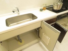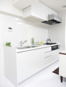浄水器付き水栓に3口コンロにグリル、ワークトップは人造大理石とスペックも◎。