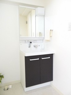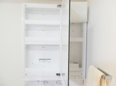 洗面化粧台は鏡の裏が一面収納になっており、コスメやハブラシなどもスッキリ収納いただけます。すぐ左側は洗濯機置場。上に吊り棚が設置されています。