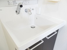 洗面化粧台と洗濯機置場はお隣同士。鏡の裏、引き出しなど小物の収納スペースも豊富です。