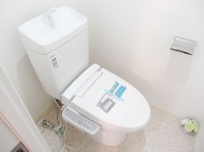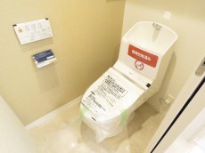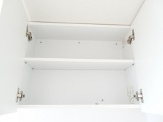 トイレはウォシュレット付き。ペーパーのストックを入れておくのに便利な吊戸棚も設置されています。