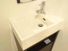 洗濯機置場と洗面化粧台はお隣同士。吊り棚や洗面ボウル下など小物の収納場所も確保されています。