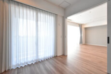 南東向きの大きな窓の付いた明るいお部屋です。中間調のフローリングに白のクロス。シンプルな色使いなのでコーディネイトの幅もグッと広がりそうですね。