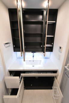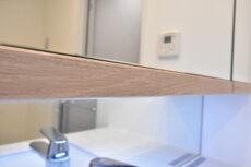 洗面化粧台は身だしなみを整えるのに便利な三面鏡付き。縁が木目なのがちょっとホッとしますね。三面鏡裏のミラーキャビネットや洗面台下のスライドキャビネットなど収納も充実。大きなものから細かいものまでバランスよく収納可能です。