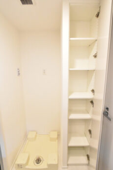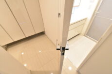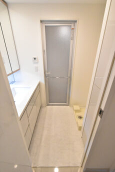 洗面室には洗面化粧台の他に、洗濯機スペース、リネン棚、浴室がまとまっていて、脱衣所も兼ねています。使うところに収納場所があるのはとても助かりますよね。そういう意味では洗濯機スペースの上に、棚など作ってランドリーグッズを置いておくのも良さそうです。