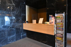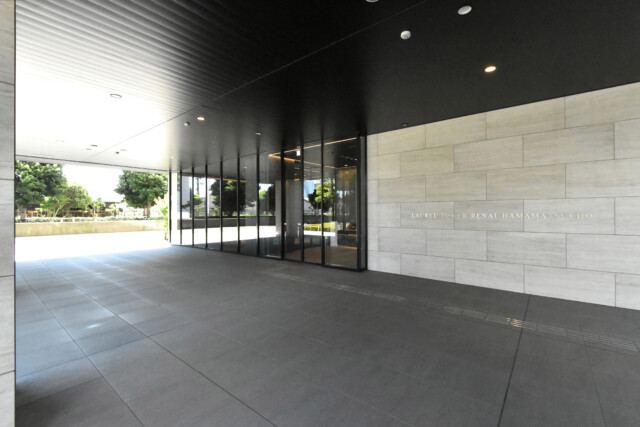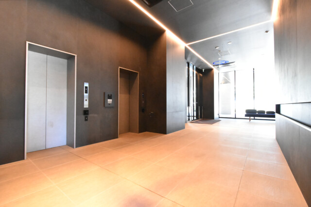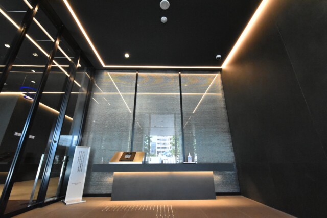 無機質な素材をモノトーンでまとめたスタイリッシュで高級感漂うエントランス。