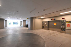 ここには2基だけですが、全部で6基のエレベーターがあります。エレベーターに関してこちらのマンションは少し変わっていて、このエレベーターでは6階までしか上がれません。もちろん非常用エレベーターというのがあってそちらは全階止まりますが、基本的に6階から先は別のエレベーターに乗り換えることになります。
