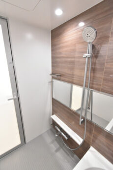 浴室はブラウンの木目のアクセントパネルを使用。清潔感の中に落ち着きを与えてくれています。個人的には真っ白も好きなんですけど、これはこれでイイ感じですね。
