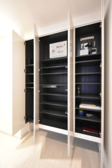 人感センサー付きの玄関照明は自動的に照明を点けてくれるので、暗い中手探りでスイッチを探したりしなくても大丈夫。いつでも明るい玄関が迎えてくれますよ。シューズボックスは収納力抜群のトールタイプ。ハンコやキーなどの小物が入る引き出しも付いています。
