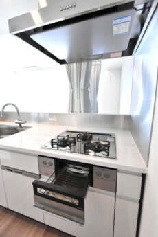 コンロは3口、グリル付き。タイマーや温度設定が可能な高機能タイプです。コンロが温度を一定に保ってくれるので揚げ物をする際などには便利ですよね。お料理中は換気扇をお忘れなく!