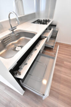 みんなの憧れ食洗器! 洗い物はお任せして食後はのんびり過ごしましょう。人の手で洗うより綺麗になるらしいですしね。水栓はお洒落なグースネック。浄水機能一体型なので気軽に美味しいお水を使えますよ。お料理やお茶はもちろんお米を研いだりにもお使いください。