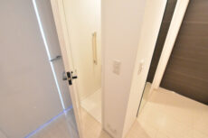 手洗いカウンター付きですが、収納棚があり、トイレは洗浄機能一体型なのでスッキリとした空間になっています。
