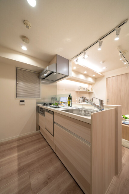 こちらがキッチンです。対面式のフルオープンなキッチンを採用することで、お部屋全体を広く見せる工夫が垣間見れます。東向きの窓があり、採光・換気に一役かってくれそうです。食器洗浄乾燥機・浄水器一体型水栓完備。