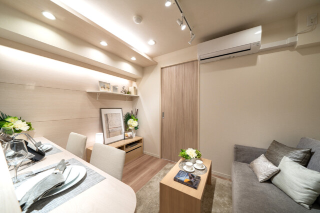 残念ながら、こちらのリビングダイニングには窓がありません。その代わりに間接照明やダウンライト等ふんだんに設置されています。