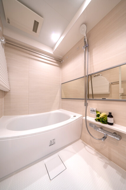 浴室にも木目が使われています。木目ってなんだか温かみがあって寛げる雰囲気がありますよね!こちらの浴槽は追い焚き機能付き。体にフィットしそうな浴槽は一日の疲れを癒してくれること間違いなしです。浴室暖房換気乾燥機も完備です!