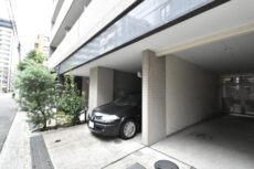 1階の一部は駐車場となっております。パンチングメタルの扉の先は駐輪場です。駐輪場は2段ラック式です。