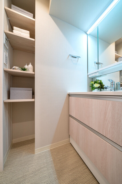 まずは洗面室からご案内します。洗面室にはナチュラルな木目の洗面化粧台が設置されています。三面鏡と引出し収納付きで、とても機能的です。洗面室の一角にはオープン収納があります。棚は可動式なので、お好きな高さに設定してお使いいただけます。浴室で使用するバスタオルや日常使いのフェイスタオルなどを置いておくのに良さそうです。