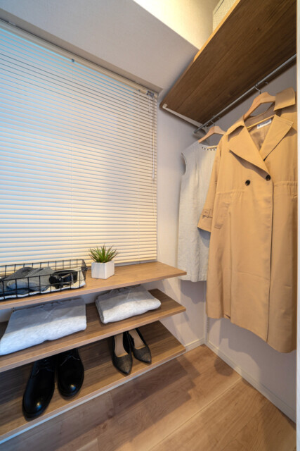 こちらの洋室には窓付きのウォークインクローゼットがあります。棚板とハンガーパイプが設置されていて、まるでどこかのアパレルのディスプレイのようにも見えます。クローゼットなのにとてもオシャレな空間に見えますね!