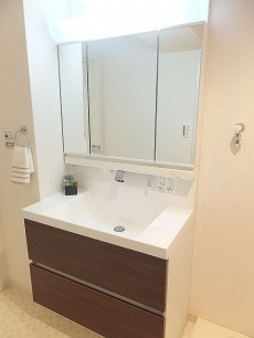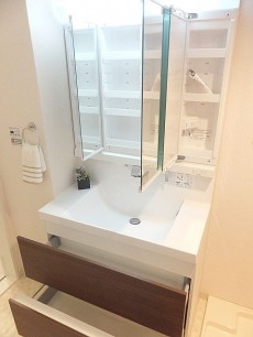 三面鏡の裏にはもちろん整理整頓しやすい収納付、