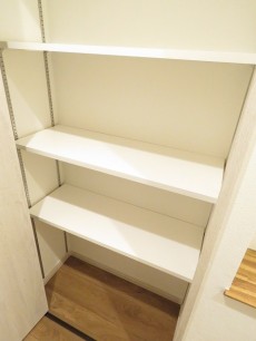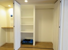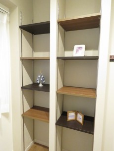 カウンターのお隣は棚付きの収納。生活感のでがちな日用品のストックはこの中に入れておくのがよさそうです。