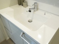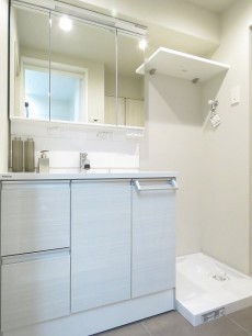 洗面化粧台は鏡の裏、引き出し、と小物の収納スペースが豊富。ゴチャゴチャ散らかりがちな水回りもスッキリ保てそうです。洗濯機置場の上側にも棚が設置されています。