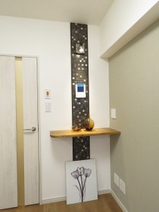 LDK内にはTEL台も設けられています。壁面のモザイクタイルがステキですね。
