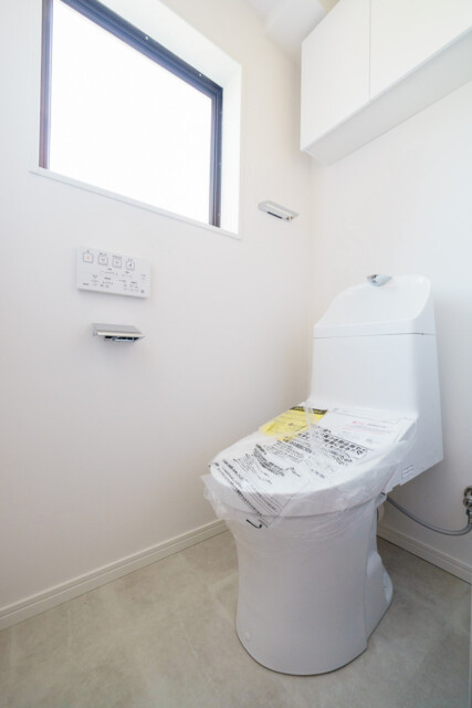 トイレはINAX製の洗浄機能一体型。トイレットペーパーのストックや掃除道具を入れておくのに便利な吊戸棚も付いています。大きめの窓が付いた明るいトイレですね。