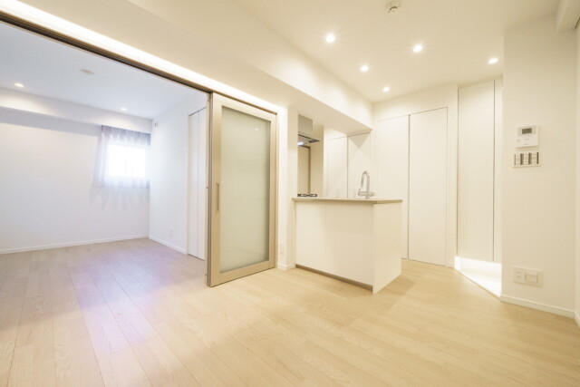 仕切り扉を全開にして二部屋をつなげた様子です。こうすれば奥の洋室をリビングにして1LDKのような使い方も可能!ご家族構成やライフスタイルによってフレキシブルに使えるのは嬉しいですね。閉めたときも窓のないDKに外光が入るよう仕切りにはガラス扉が使われています。玄関からは廊下も扉もありませんので、気になる方は衝立などの目隠しの利用をご検討ください。
