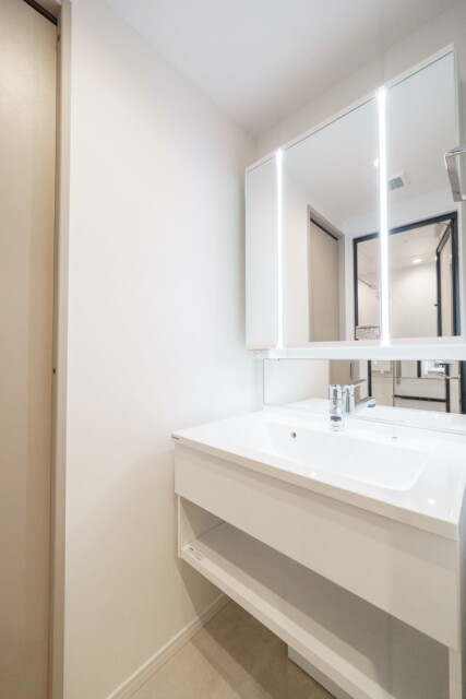 洗面室には洗面化粧台の他に浴室とトイレがまとまっていて、脱衣所を兼ねています。洗面化粧台は身だしなみを整えるのに便利な三面鏡付き。鏡の間に照明が付けられ鏡を開いても影にならない優れものです。裏がキャビネットになっているので洗面周りに散らかりがちな細々したものもすっきり片付きますよ。