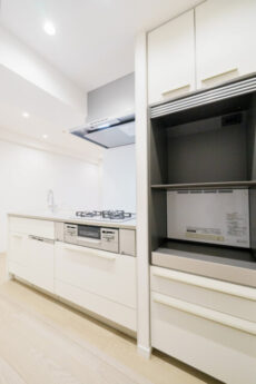 キッチンはフローリングに馴染む木目柄。浄水機能付き水栓、2口ガスコンロ、食洗機付きとスペック◎。キッチン収納の他、カップボードも設置されており収納がたっぷりあるのもうれしいところ♪