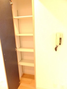 ダイニングスペースを挟んで、洗濯機置場の正面には収納用の棚があります。
