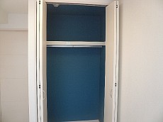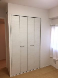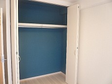 玄関入ってすぐの4.5帖の洋室です。白いクローゼットをあけると鮮やかなブルーのクロスがみえインパクトがあります。奥行きもあり使い勝手良さそうです。
