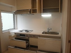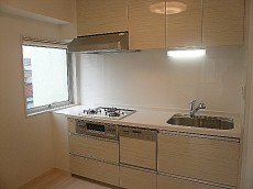 食器洗乾燥機・浄水器付の3.5帖のキチンです。3口コンロ横には大きな窓もありお魚を焼いて匂いがでても自然換気できますね。明るいキッチンです♪