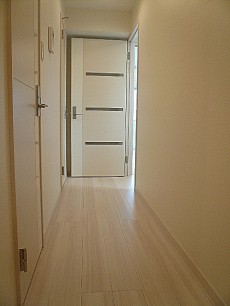 ドアを開けると白を基調としたクロスとナチュラルで柔らかい色のフローリングの廊下がふんわりする気分な雰囲気です。玄関左側にはトールサイズの玄関収納があります。